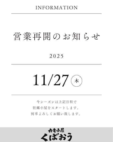 かき小屋 くばおうより、今シーズンの営業開始日が決定いたしましたことをお知らせいたします。